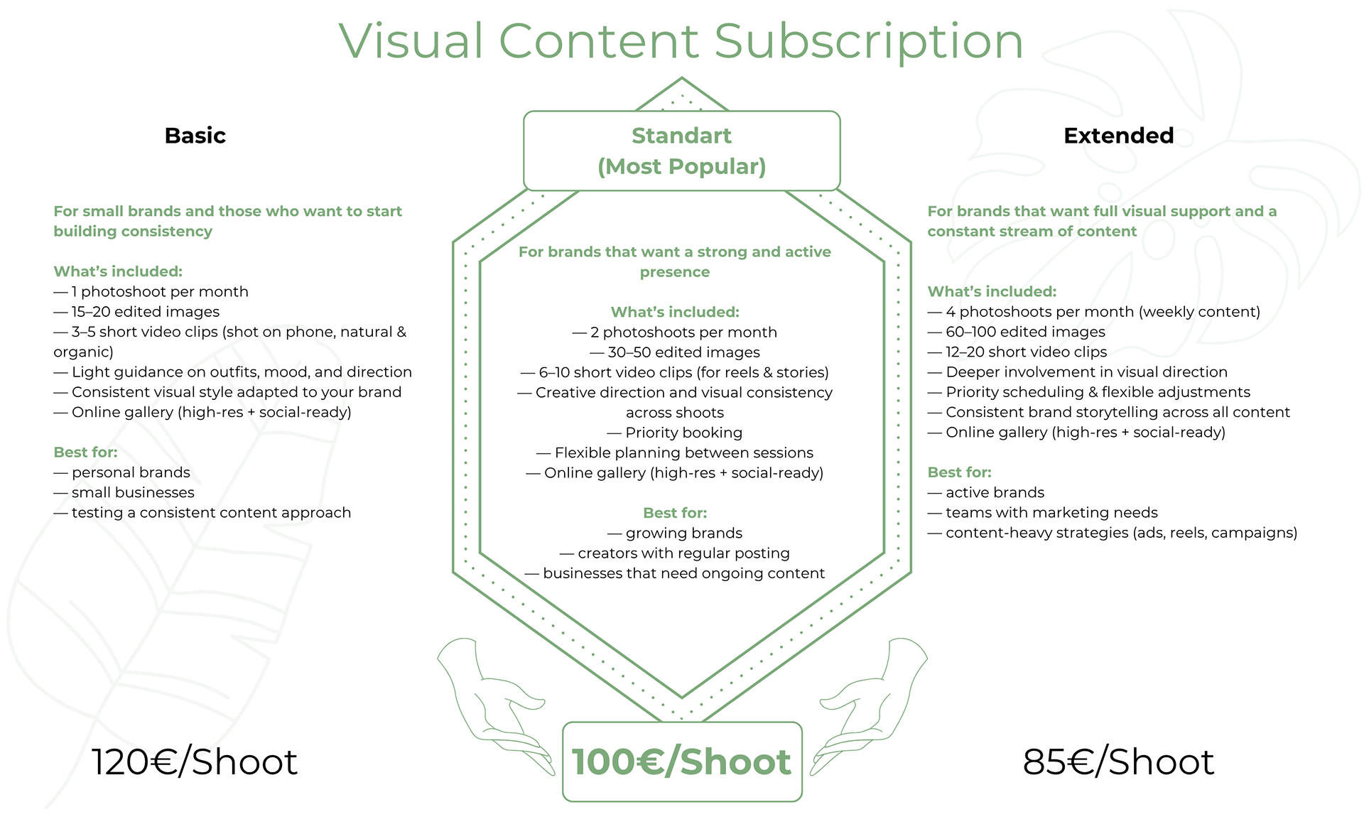 I work with brands on a monthly basis, creating a consistent visual language that reflects your identity, mood, and message. Not random photos. Not one-time shoots. But a system of visual content.
